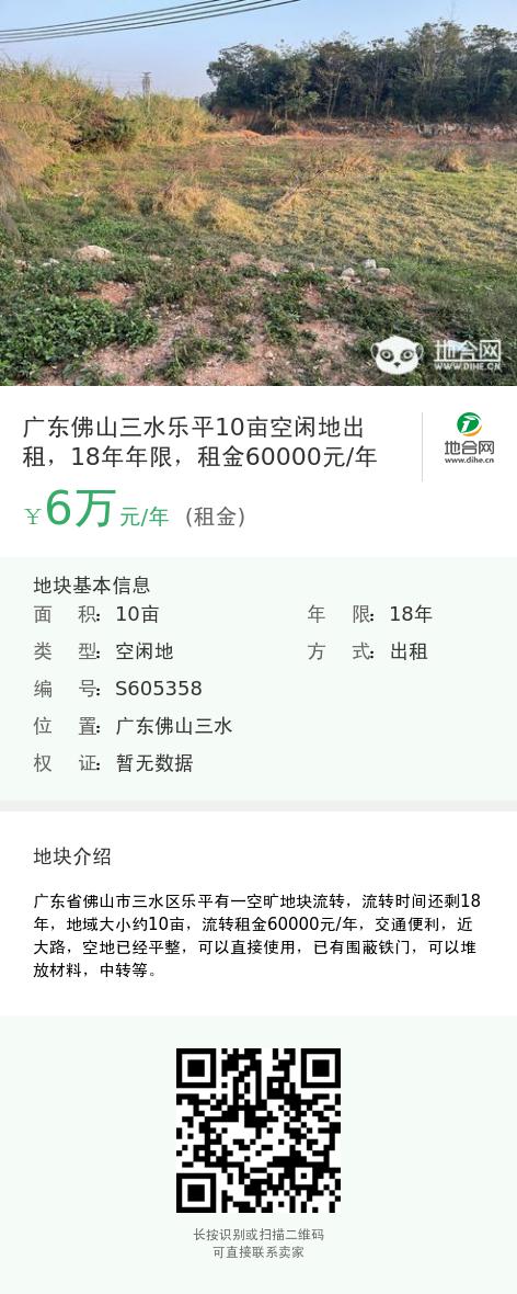 广东佛山三水乐平10亩空闲地出租,18年年限,租金60000元/年